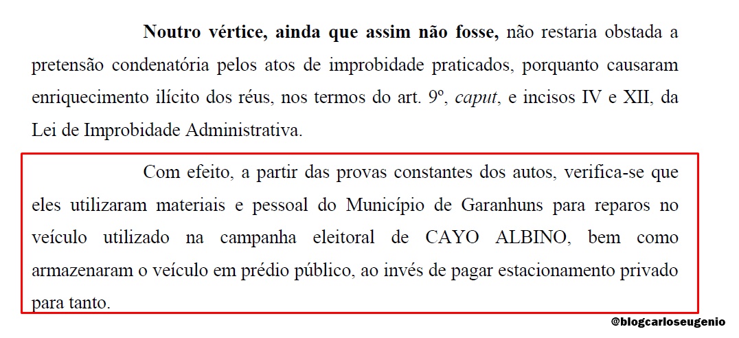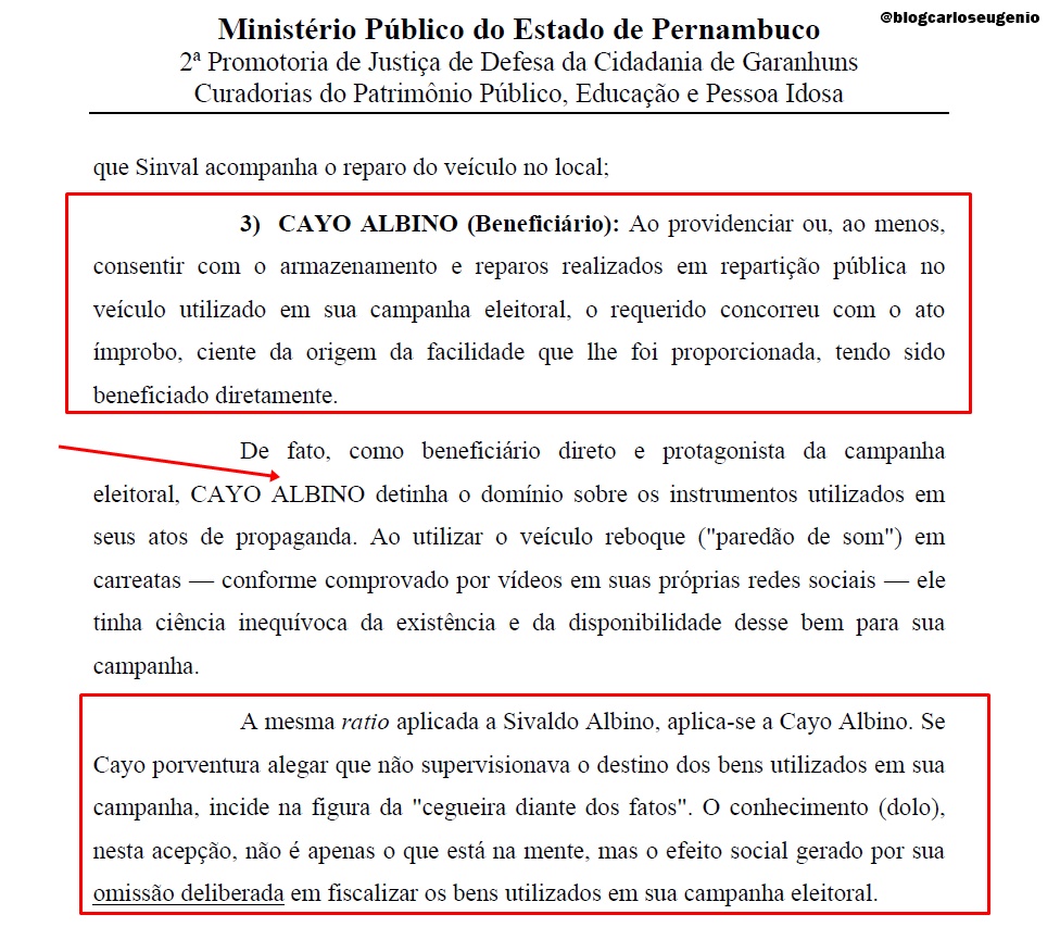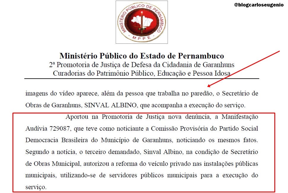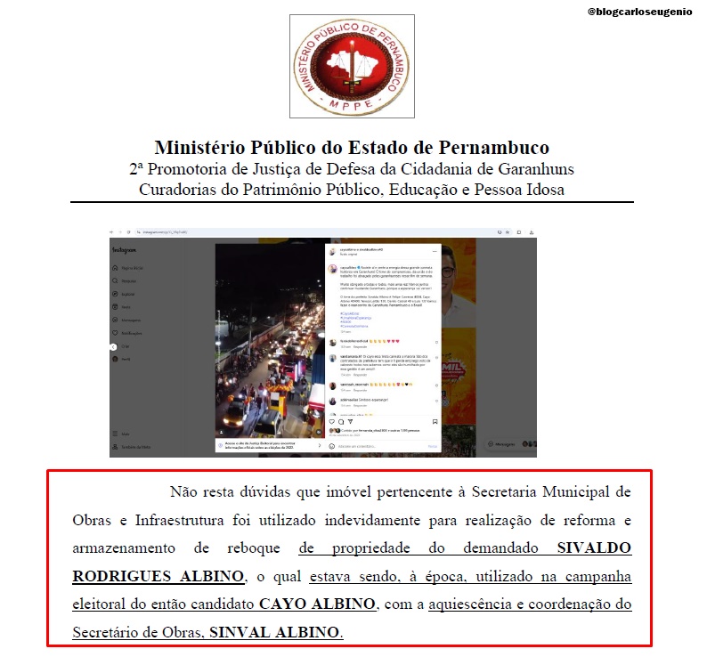 O Ministério Público de Pernambuco (MPPE) ajuizou uma Ação de Improbidade Administrativa contra o Prefeito de Garanhuns, Sivaldo Albino, o Ex-deputado estadual Cayo Albino e o secretário Municipal de Obras, Sinval Albino (Fá Albino), por suposto uso indevido de bens e serviços públicos em benefício de campanha eleitoral.