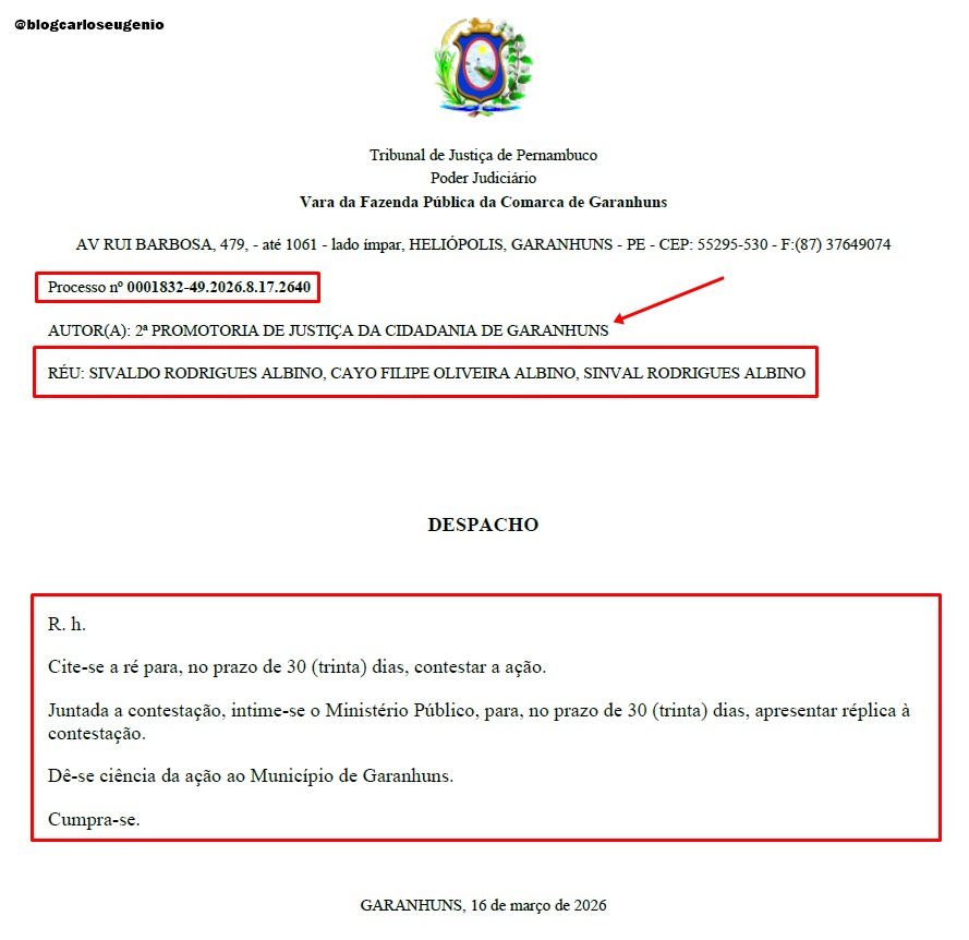 Em despacho no último dia 16 de março, o Juiz Glacidelson Antonio determinou que Sivaldo, Cayo e Fá Albino pudessem se posicionar num prazo de 30 dias. Cumprido o prazo, e de posse da contestação dos réus, segundo o Magistrado, o MPPE terá trinta dias para apresentar a réplica. Cumpridas estas etapas, o Juiz deverá formular decisão sobre o mérito da ação. Baixe AQUI os documentos referentes a Ação do MPPE.