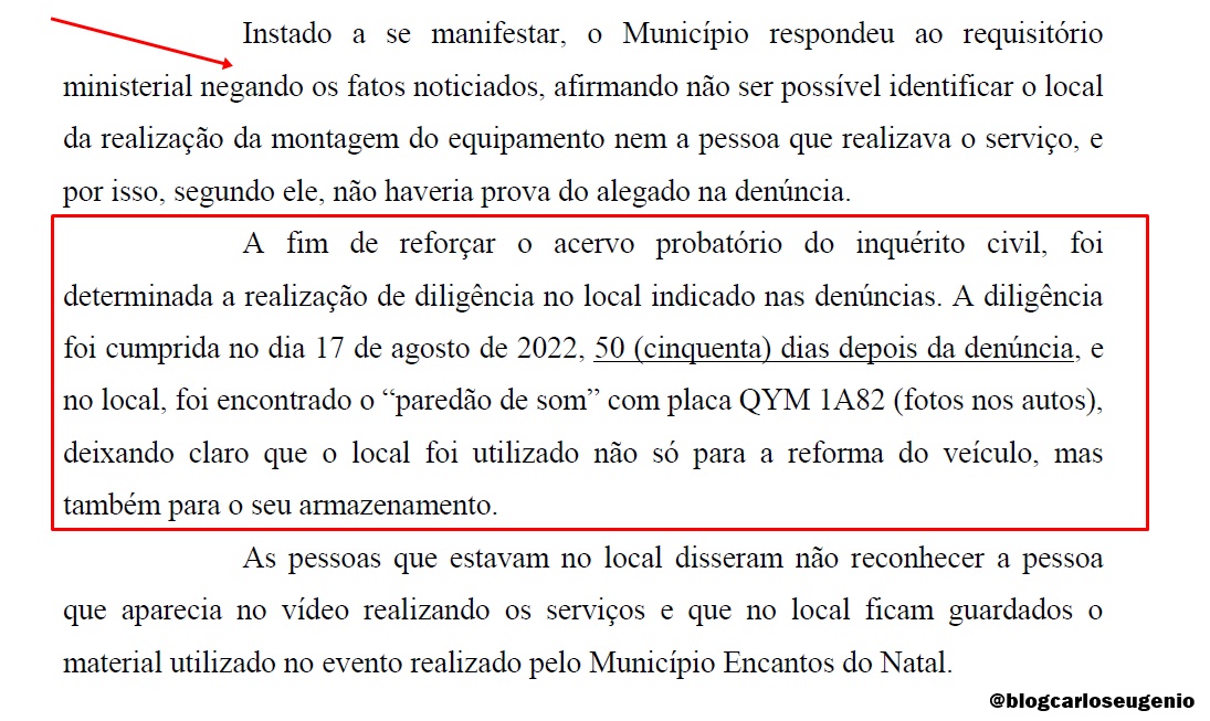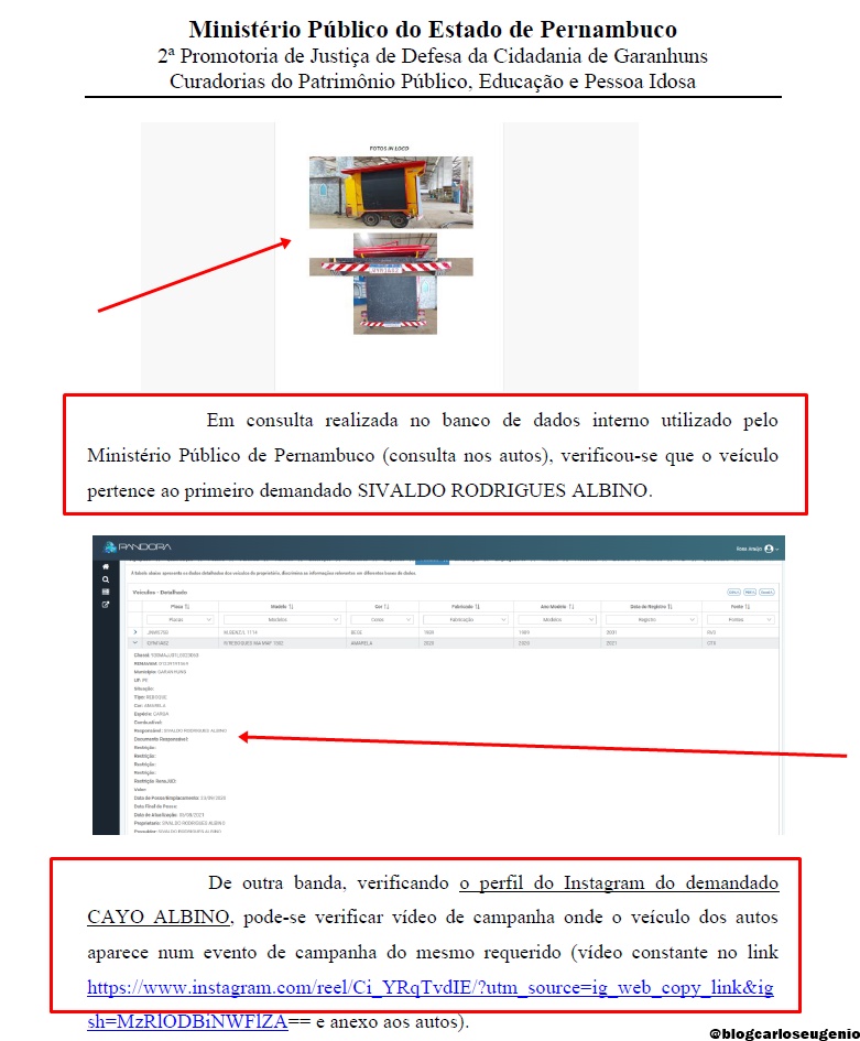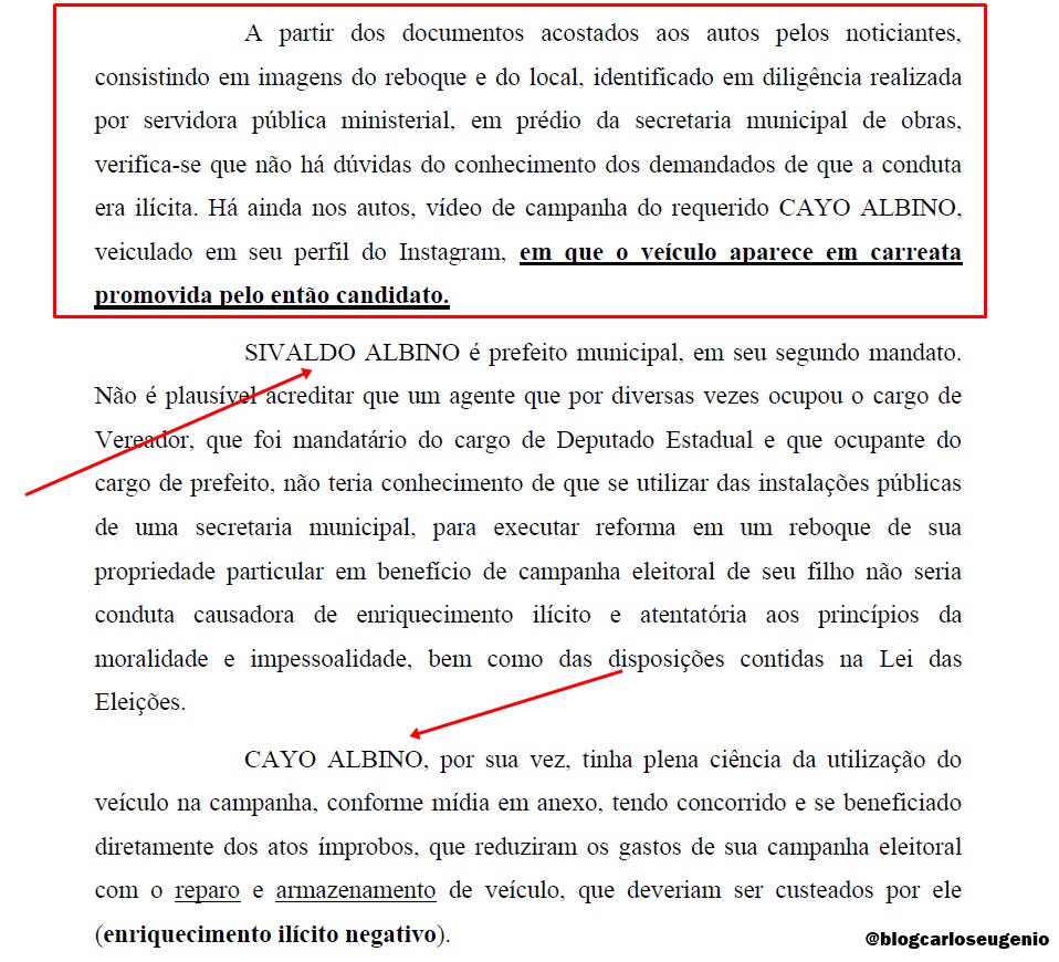 Ainda conforme o Ministério Público, consulta a banco de dados interno apontou que o reboque pertence ao Prefeito Sivaldo Albino. Além disso, vídeos publicados nas redes sociais de Cayo Albino mostram o equipamento sendo utilizado em atos de campanha.