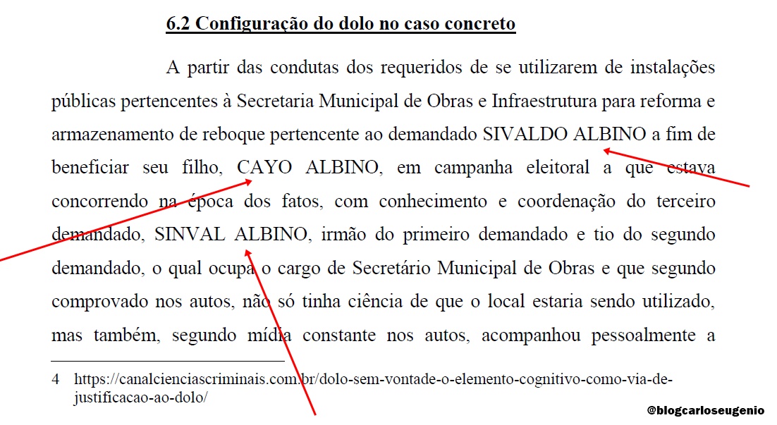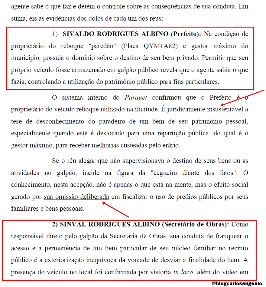 O Órgão sustenta que houve dolo, ou seja, intenção, por parte dos envolvidos. Segundo a Promotoria, o Prefeito, como proprietário do equipamento e Gestor Municipal, teria permitido o uso da estrutura pública; o secretário de Obras teria autorizado e acompanhado os serviços; e o Ex-deputado teria se beneficiado diretamente do uso do equipamento na Campanha.