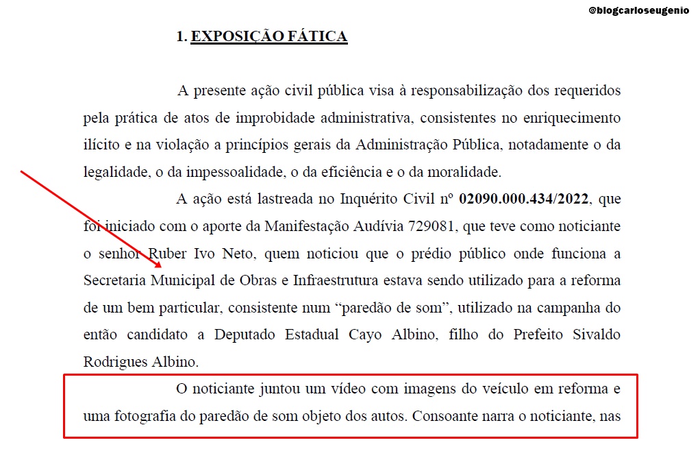 De acordo com a ação, fundamentada no Inquérito Civil nº 02090.000.434/2022, os investigados teriam utilizado um imóvel da Secretaria Municipal de Obras e Infraestrutura para reformar e armazenar um “paredão de som” pertencente ao Prefeito, que foi empregado na campanha eleitoral do então candidato Cayo Albino, as eleições de 2022.