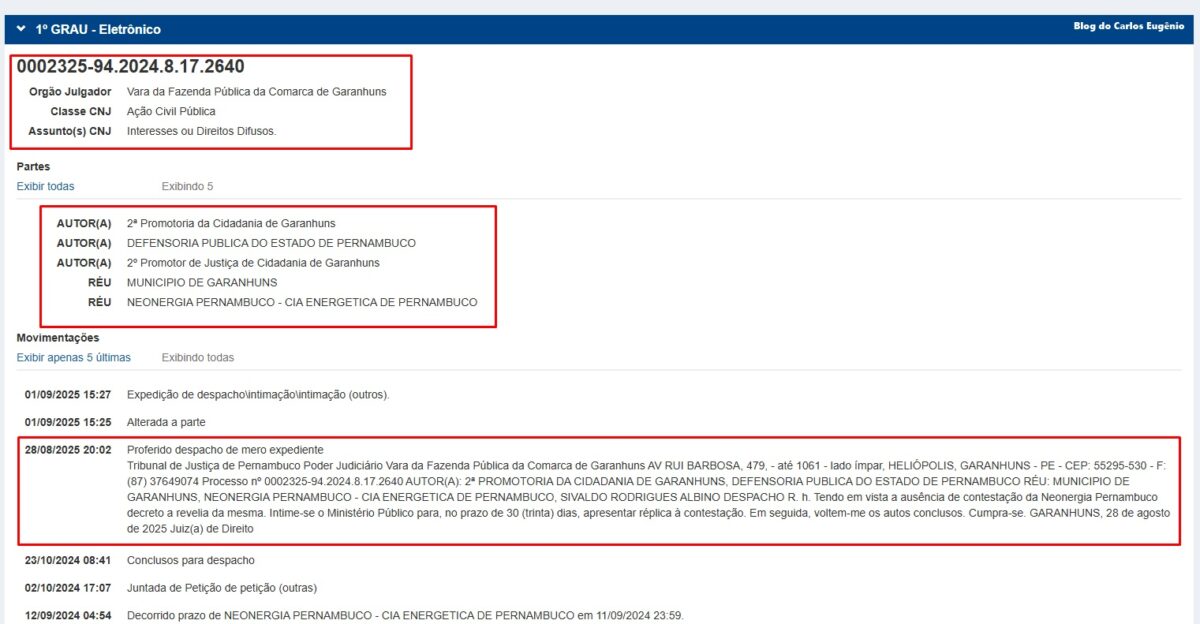 É que o Juiz da Vara da Fazenda Pública de Garanhuns trouxe despacho no último dia 28 de agosto, registrando a ausência de contestação por parte da Neonergia Pernambuco e decretando à revelia da mesma. O Magistrado também intimou o Ministério Público para, no prazo de 30 dias, apresentar réplica à contestação.