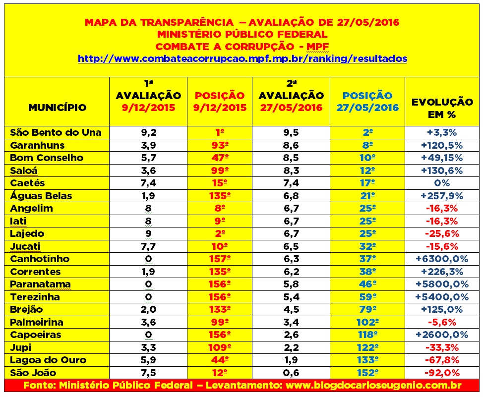 posicionados no ranking da Transparência do MPF. Já Canhotinho, Paranatama, Terezinha