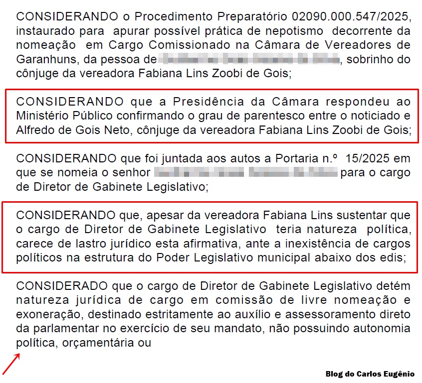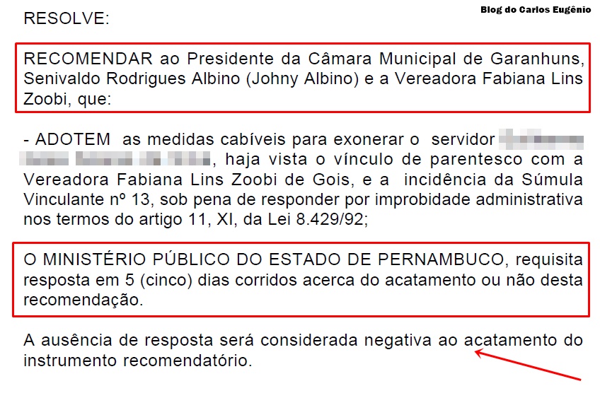 Segundo o documento publicado no Diário Oficial Eletrônico do MPPE, a Presidência da Câmara confirmou o grau de parentesco, e a Promotoria entendeu que a nomeação viola os princípios constitucionais da impessoalidade e da moralidade administrativa. Diante disso, o MPPE recomendou ao presidente da Câmara, o vereador Johny Albino e à Vereadora que adotem as medidas necessárias para a exoneração do Servidor.