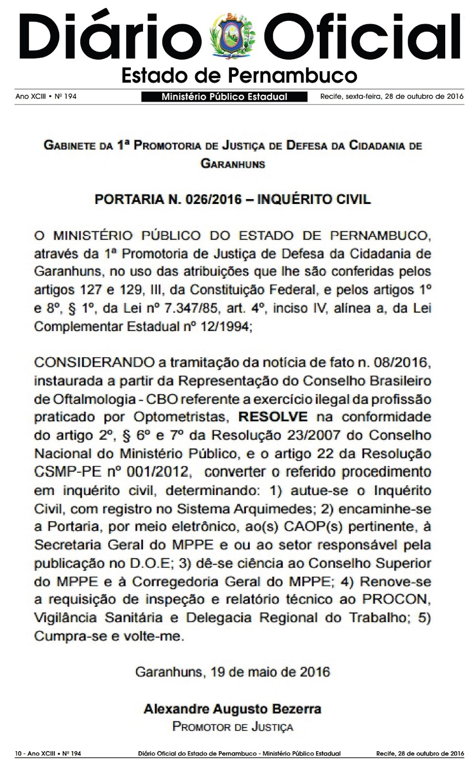o Inquérito foi publicada no Diário Oficial de Pernambuco no último dia 28 de