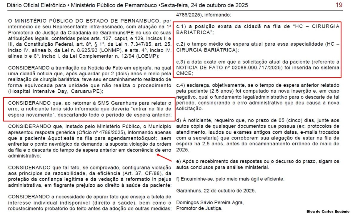 ATUALIZADA AS 12H, DE 24/10/2025 – Publicada no Diário Oficial do Ministério Público de Pernambuco desta sexta-feira, dia 24, a Portaria nº 02088.000.717/2025, assinada pelo promotor Domingos Sávio, da 1ª Promotoria de Justiça de Defesa da Cidadania de Garanhuns, determinou a instauração de um Procedimento Administrativo para apurar possíveis irregularidades na fila de espera por cirurgia bariátrica no Município.