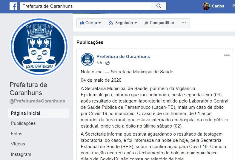 Garanhuns, foi informada pela Secretaria Estadual de Saúde. Agora, o Município