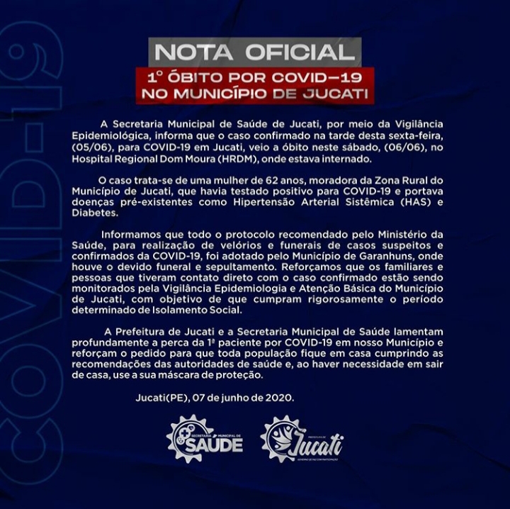 COVID-19, o Município de Jucati já registrou 13 casos positivos da Doença,