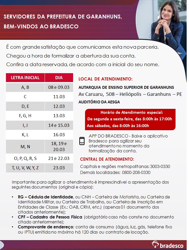 atendimento, o servidor pode acessar o link: https://www.bradescopoderpublico.com.br/prefeituradegaranhuns/index.shtm e