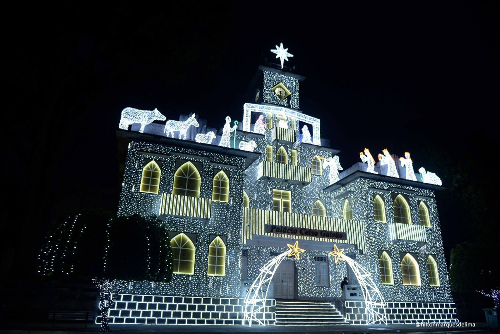 nascimento de Cristo. O prédio histórico apresenta o presépio montado com os