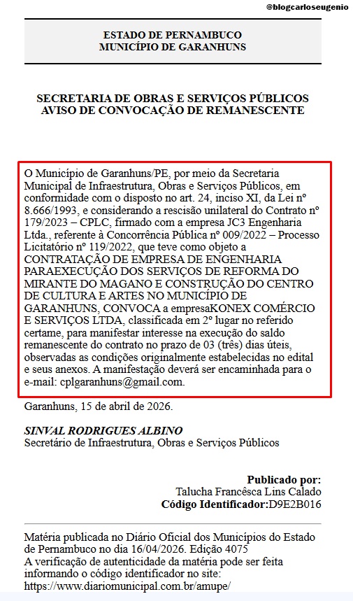 Mas já existe luz no fim do túnel. É que após a conclusão de um Processo Administrativo, a Prefeitura de Garanhuns decidiu rescindir o contrato com a empresa JC3 Engenharia Ltda, responsável pela execução dos serviços. Com a medida, o Município convocou a empresa Konex Comércio e Serviços Ltda., segunda colocada no Processo Licitatório nº 119/2022, para assumir o saldo remanescente da obra.