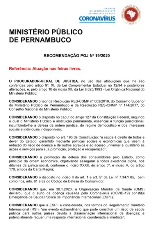 pelo Ministério Público de Pernambuco, através da Recomendação PGJ nº 19/2020.