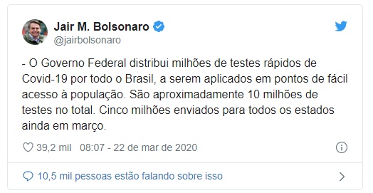 BOLSONARO ANUNCIA DISTRIBUIÇÃO DE NOVOS TESTES – E o presidente Jair Bolsonaro usou neste