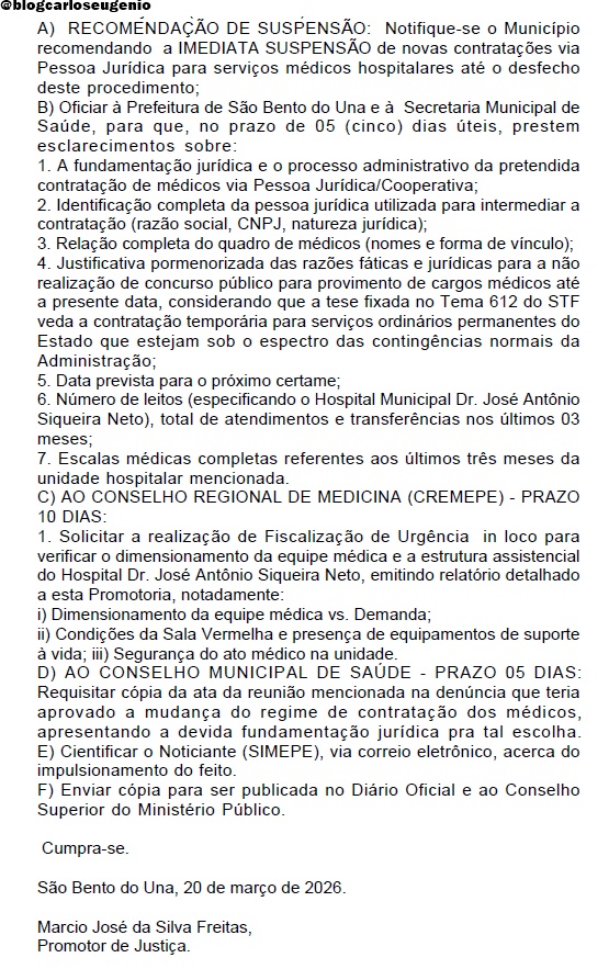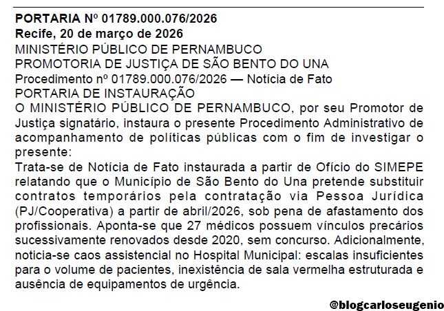O caso segue em apuração e pode resultar na adoção de medidas judiciais. A Prefeitura de São Bento do Una ainda não se pronunciou sobre a ação do MPPE. Saiba mais AQUI. (@blogcarloseugenio)