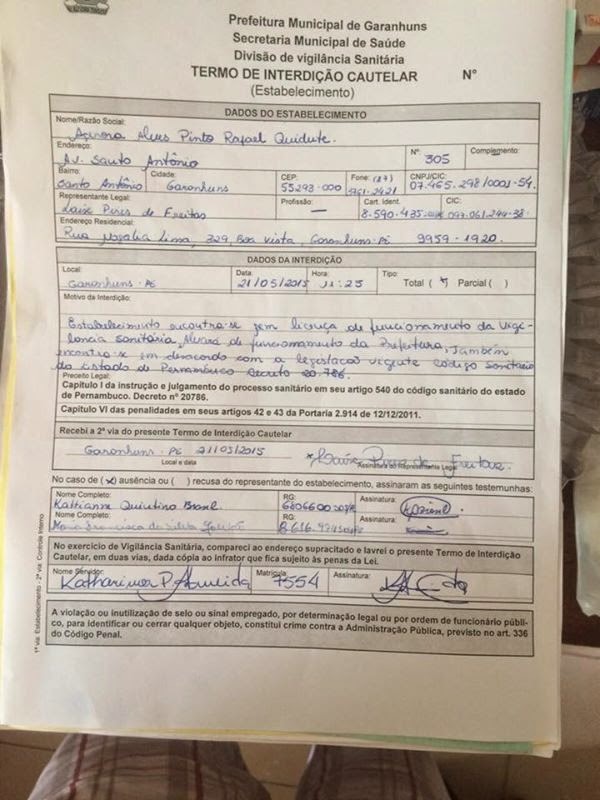 estava sem licença de funcionamento da Vigilância Sanitária e Alvará de Funcionamento