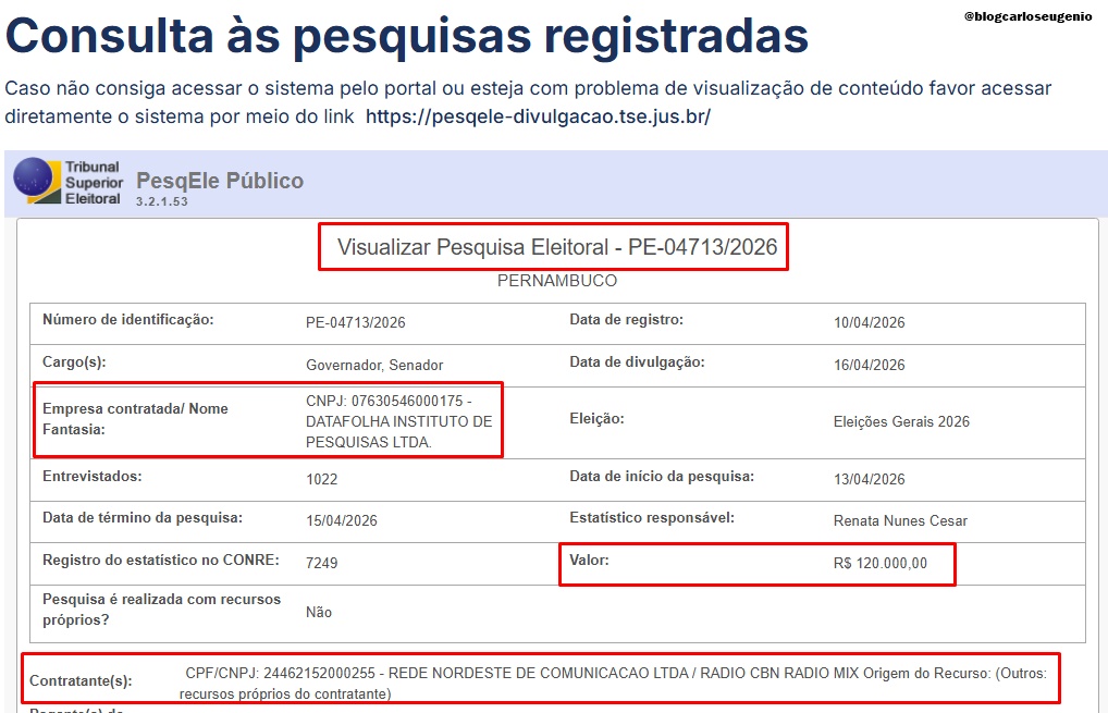 No cenário espontâneo, quando o entrevistado cita em quem pretende votar sem a apresentação de nomes, João Campos e Raquel Lyra aparecem, de acordo com Datafolha, empatados dentro da margem de erro, com vantagem numérica para a Governadora: 28% a 26%. O levantamento está registrado sob o número PE-04713/2026. Saiba mais AQUI. (@blogcarloseugenio)