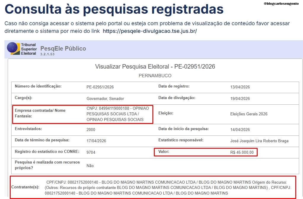 Na espontânea, o estudo contratado pelo Blog por R$ 45 mil reais, aponta João com 29,5% e Raquel com 27,1% das intenções de voto. Brancos e nulos somam 4,5% e indecisos sobem para 38,1%. A pesquisa foi registrada na justiça eleitoral com o protocolo de número PE-02951/2026.