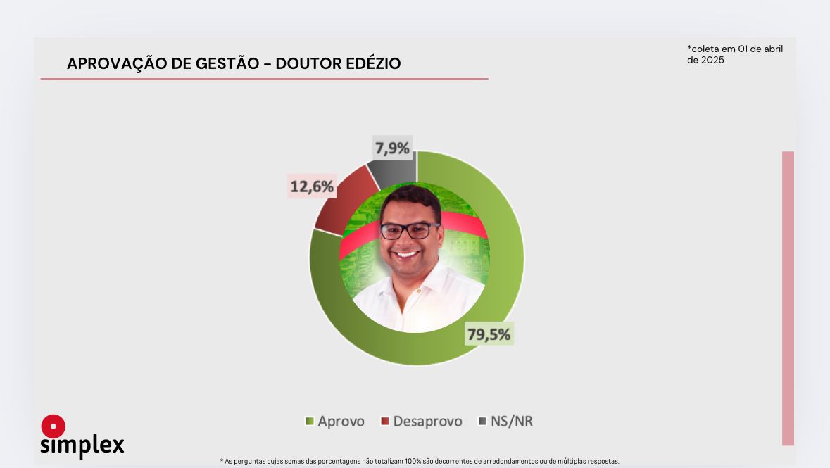 Segundo o Simplex os que aprovam a Gestão Doutor Edézio somam 79,5%, enquanto 12,5% desaprovam o modelo de Gestão do Prefeito Bom-conselhense. 7,9% não responderam ou disseram não saber avaliar o trabalho do Gestor. O Blog do Elielson, em parceria com a CBN, também trará os números da pesquisa do Simplex na Terra de Papa caça. (@blogcarloseugenio)