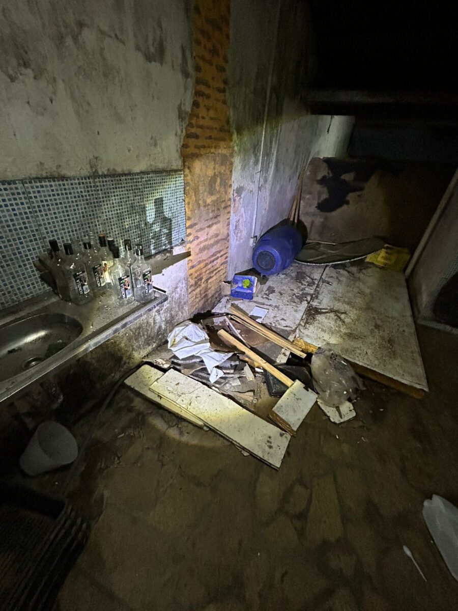 Durante as buscas, os policiais identificaram um imóvel na Rua Luís Gama, de onde vinham barulhos de manuseio de garrafas e um forte odor de álcool. No local, dois Homens foram surpreendidos no momento em que envasavam bebidas falsificadas.