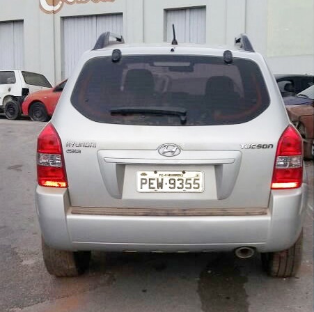 um Tucson, de cor prata, e placas PEW 9355, coberto por uma lona defronte a