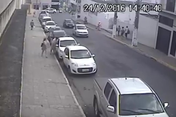mostram o momento exato em que o veículo Grand Siena é arrombado e sacolas são