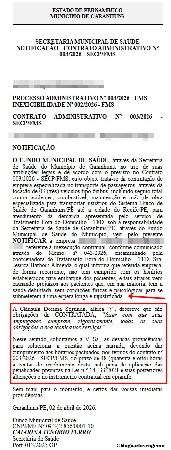 A Secretaria de Saúde de Garanhuns notificou a Empresa que presta o serviço de transporte de pacientes do SUS por descumprimento contratual das atividades referentes ao Tratamento Fora do Domicílio (TFD) até o Recife.