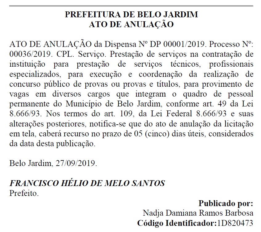 Hélio de Melo Santos, assinou no último dia 27 de setembro, o Ato de Anulação