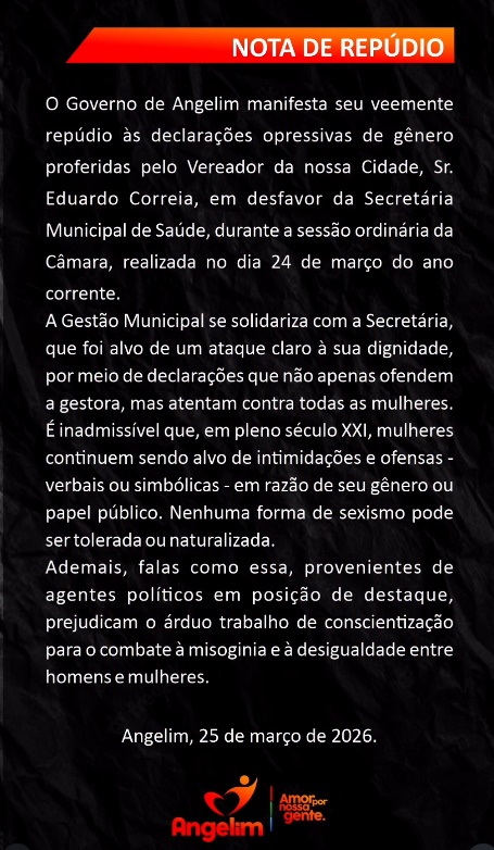 Ainda em resposta, Eduardo criticou a edição do vídeo divulgado pelo Prefeito. “Peço a todos que assistam o vídeo com o meu pronunciamento na totalidade e não com a edição feita pelo Prefeito de Angelim (…); que de forma desonesta, busca me rotular como um Homem que desrespeita Mulheres, o que garanto não ser”, afirmou.