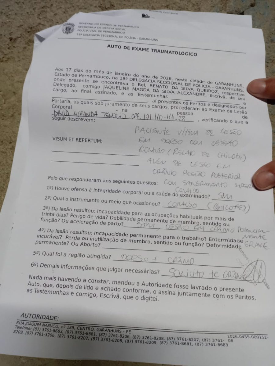 O Auto de Exame Traumatológico, realizado pelo Instituto de Medicina Legal (IML), confirmou a existência das agressões. O laudo pericial apontou lesões no dorso provocadas por objeto contundente, compatíveis com chicote, além de uma lesão na região posterior do crânio, com sangramento subcutâneo. O perito classificou a lesão na cabeça como grave e recomendou a realização de tomografia craniana para avaliação complementar. Não há informações sobre as possíveis causas das agressões sofridas por David Miranda Tenório.