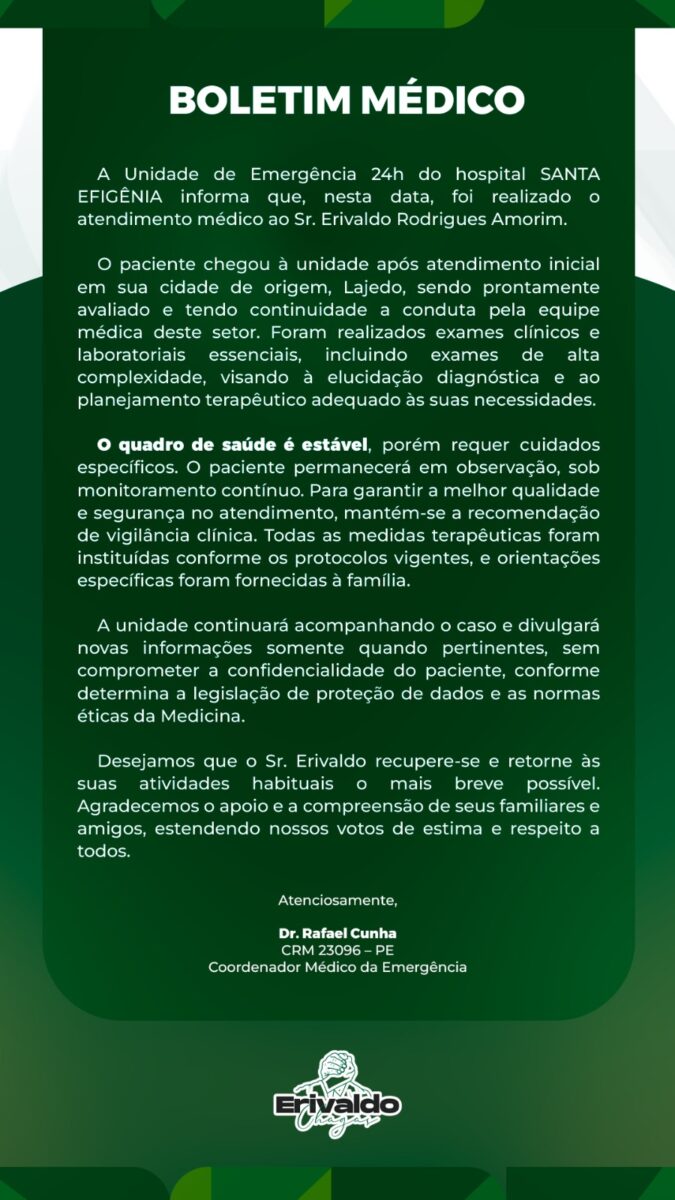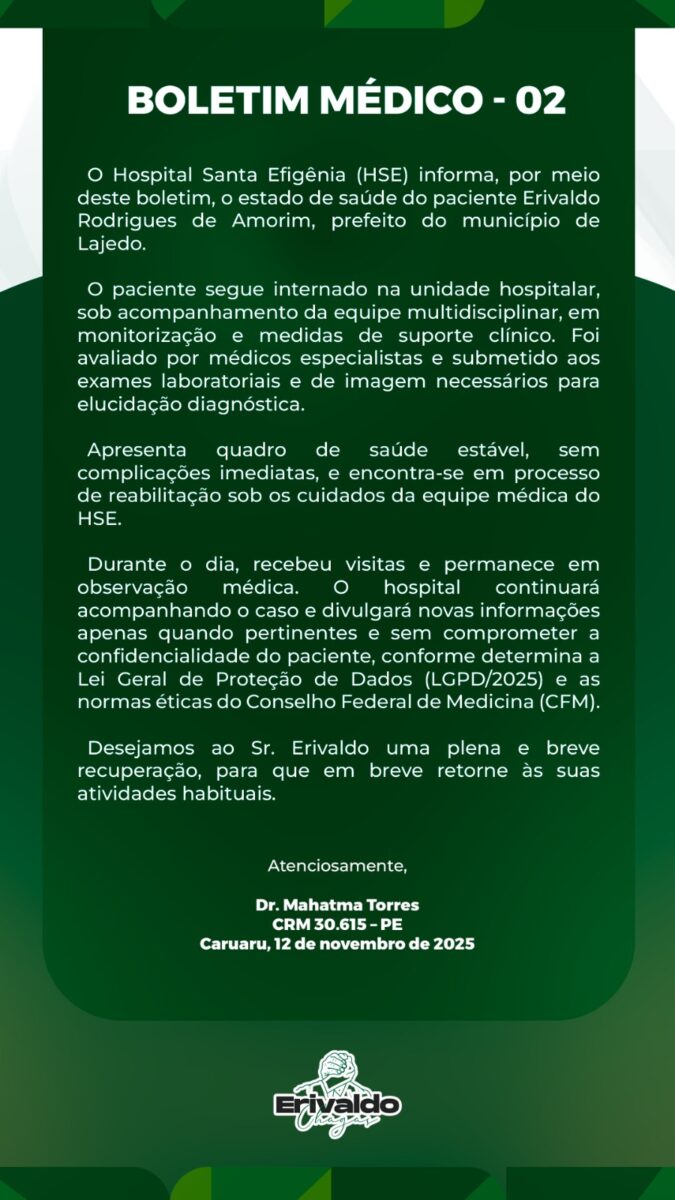 Já o segundo boletim médico, assinado pelo Dr. Mahatma Torres e divulgado na noite de ontem, dia 12, reforçou que o paciente segue internado, acompanhado por uma equipe multidisciplinar e em processo de reabilitação. Segundo o informe, Erivaldo apresenta quadro de saúde estável, sem complicações imediatas, e tem respondido bem ao tratamento.