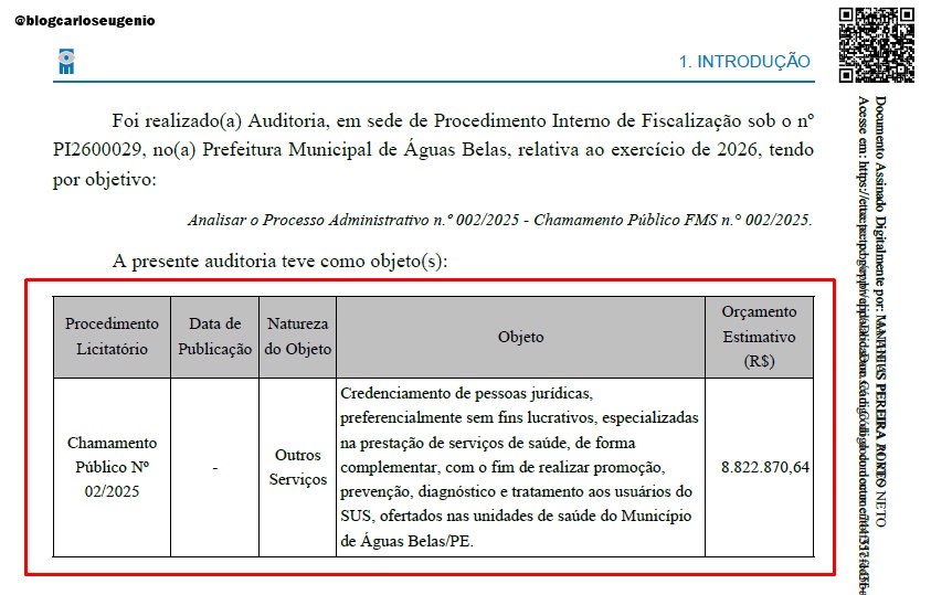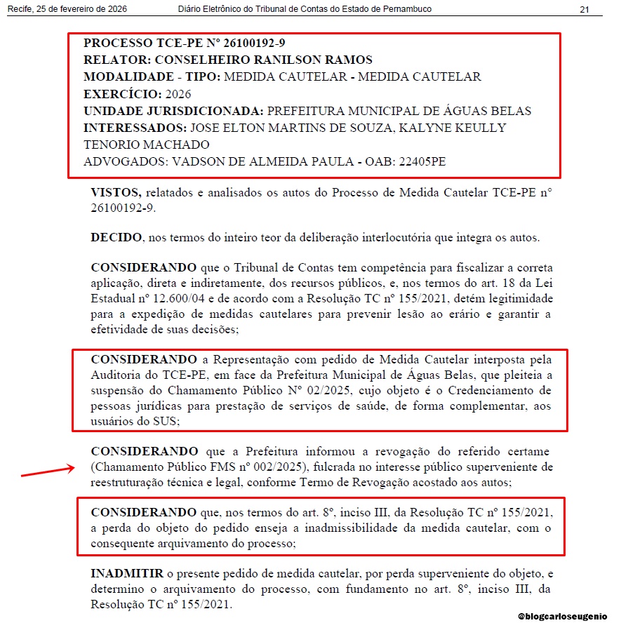 Com a revogação do certame, o Tribunal determinou o arquivamento do processo cautelar, mantendo o relatório de Auditoria como registro técnico das análises realizadas. A Prefeitura de Águas Belas não se posicionou se republicará o Edital com as devidas correções. Para saber mais, clique AQUI. (@blogcarloseugenio)