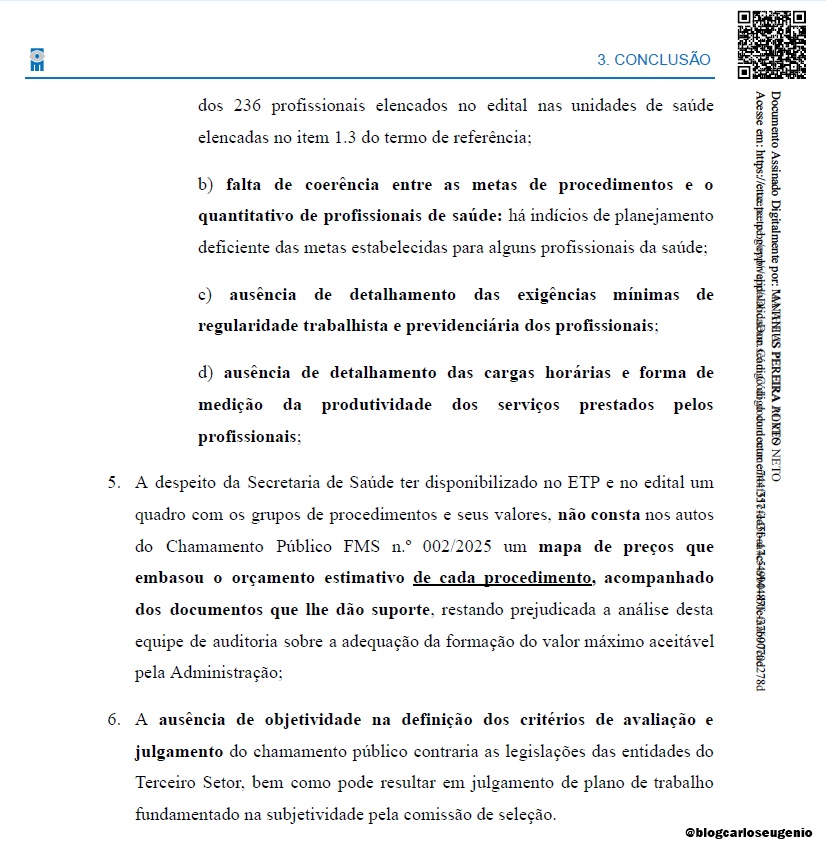 Antes do arquivamento, relatório preliminar de auditoria do TCE apontou falhas no edital, como falta de clareza jurídica, ausência de justificativa técnica para a complementação dos serviços do SUS, fragilidades no planejamento e ausência de planilha de custos.