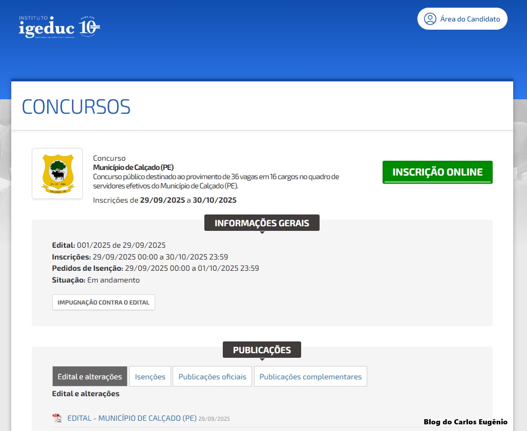 A Seleção ocorrerá por meio de prova objetiva, de caráter eliminatório e classificatório, marcada para o dia 4 de janeiro de 2026. Para funções de nível superior, haverá ainda avaliação de títulos. O conteúdo programático abrange conhecimentos gerais e específicos, de acordo com cada cargo. O concurso terá validade inicial de dois anos, a partir da homologação do resultado, podendo ser prorrogado por igual período. O edital completo e as inscrições poder ser acessadas AQUI. (@blogcarloseugenio)