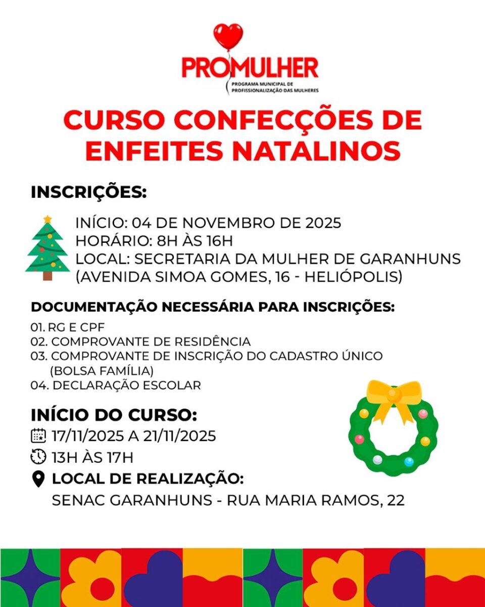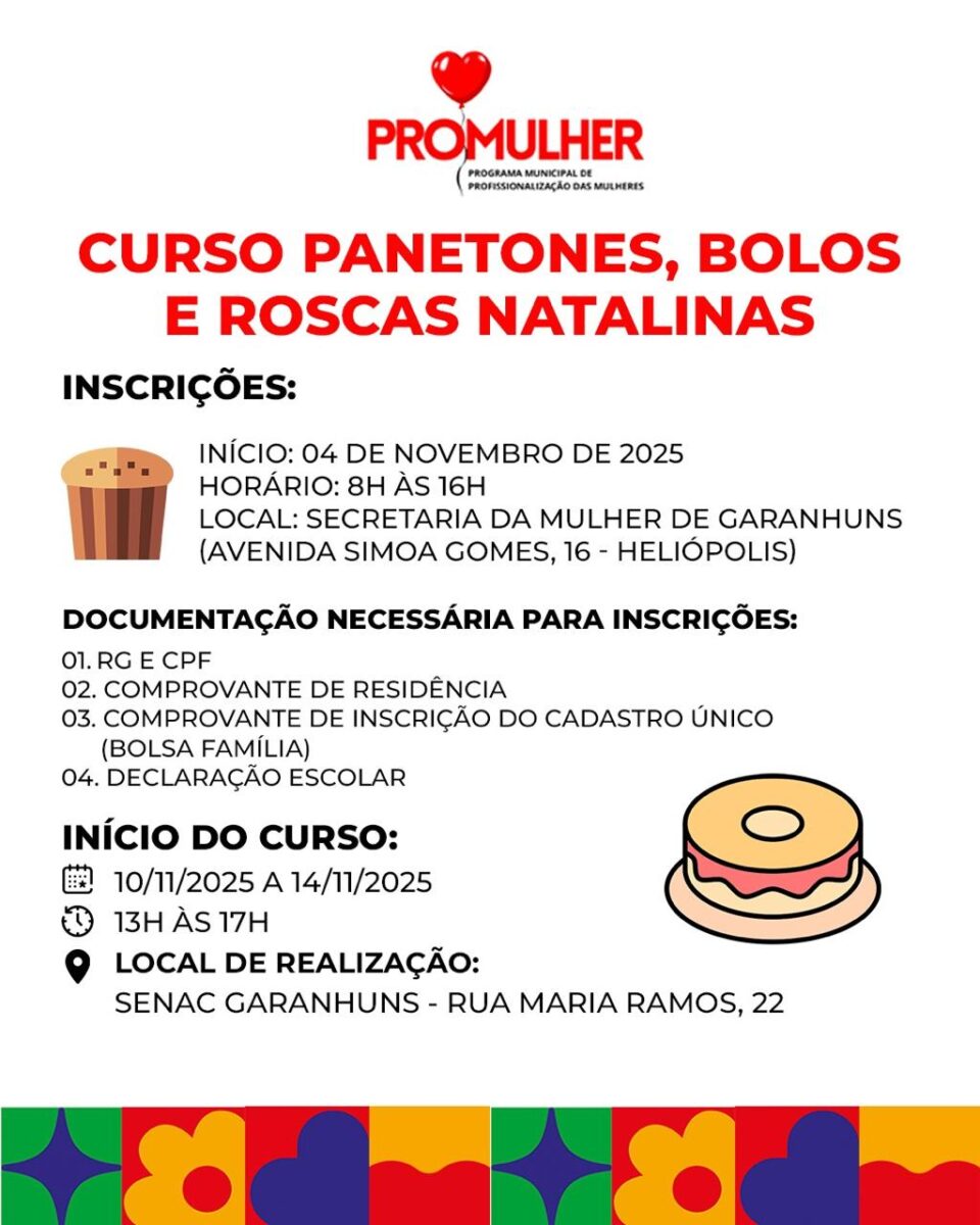 A Secretaria da Mulher, em parceria com o Senac Garanhuns, abriu inscrições para os cursos: “Panetones, Bolos e Roscas Natalinas” e “Enfeites Natalinos”, voltador para as mulheres do Município.