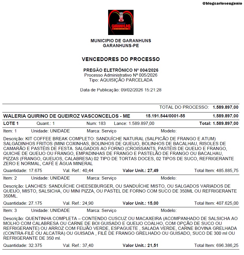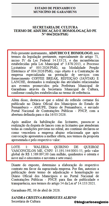 A Prefeitura de Garanhuns vai investir quase um milhão e seiscentos mil reais (R$ 1.589.897,00) em coffee break, refeições (jantar) e lanches. A definição do investimento foi publicada no Diário Oficial desta terça-feira, dia 7, com a Homologação do Pregão Eletrônico nº 004/2026/PMG.