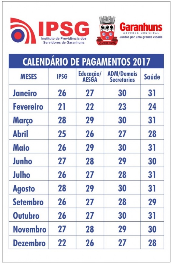 (IPSG), divulgou nessa terça-feira, dia 10, o calendário de pagamentos dos Servidores