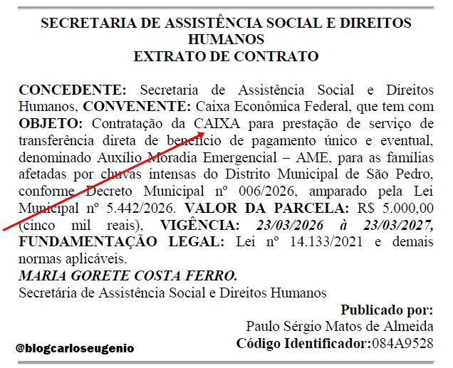 CRIAÇÃO DO AUXÍLIO – O Auxílio Municipal Emergencial foi instituído pela Lei nº 5.442/2026, sancionada pelo Prefeito Sivaldo Albino, após aprovação na Câmara de Vereadores. A medida foi adotada em resposta à situação de emergência decretada pelo município, em decorrência das chuvas intensas que atingiram o Distrito de São Pedro.