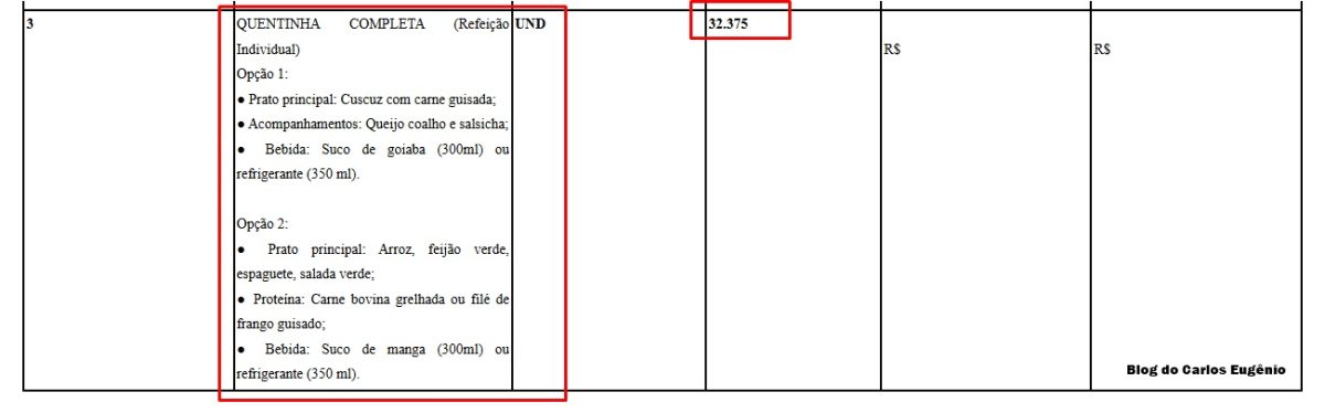 As Quentinhas deverão apresentar cardápios variados, incluindo opções como cuscuz com carne guisada, queijo coalho ou salsicha; arroz, feijão verde, espaguete e salada verde; além de carne bovina grelhada ou filé de frango guisado, acompanhados de sucos e refrigerantes.