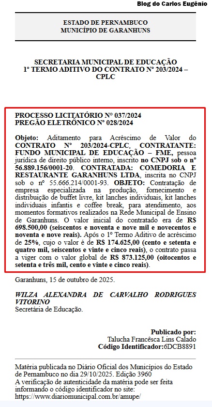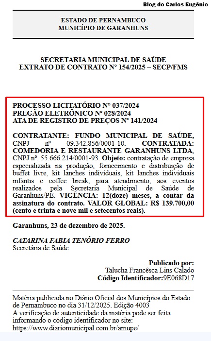 INVESTIMENTO EM 2025 – Levantamento realizado pelo Blog do Carlos Eugênio junto as publicações oficiais, registram que em 2025, o Governo de Garanhuns contratou mais de dois milhões e quatrocentos mil reais (R$ 2.411.938,75) com buffet, coffee-break, refeição e lanche, destinados aos eventos promovidos por diversas Secretarias, Gabinete do Prefeito e Autarquias Municipais. O destaque ficou para o valor de R$ 1.086.178,50 voltado a realização do 33º FIG.