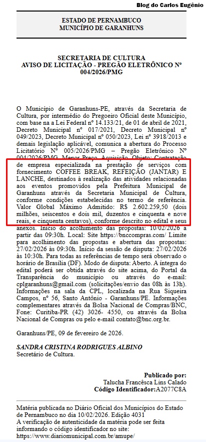 MAIS DE R$ 5 MILHÕES – Levantamento realizado pelo Blog do Carlos Eugênio junto as publicações oficiais, registram que em 2025, o Governo de Garanhuns contratou mais de dois milhões e quatrocentos mil reais (R$ 2.411.938,75) com buffet, coffee-break, refeição e lanche, destinados aos eventos promovidos por diversas Secretarias, Gabinete do Prefeito e Autarquias Municipais. O destaque ficou para o valor de R$ 1.086.178,50 voltado a realização do 33º FIG (saiba mais AQUI).
