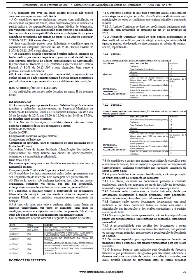 extemporâneas ou em desacordo com as normas do edital que está disponível em http://www.diariomunicipal.com.br/amupe/.