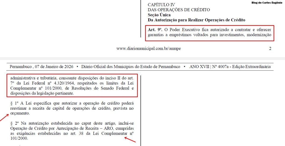 A Lei ainda autoriza o Executivo a abrir créditos suplementares de até 30% do total da despesa fixada mediante decreto assinado pelo Prefeito Sivaldo Albino, além de permitir operações de crédito dentro dos limites da Lei de Responsabilidade Fiscal (LRF). O orçamento entrou em vigor no último dia 1º de janeiro. (@blogcarloseugenio)