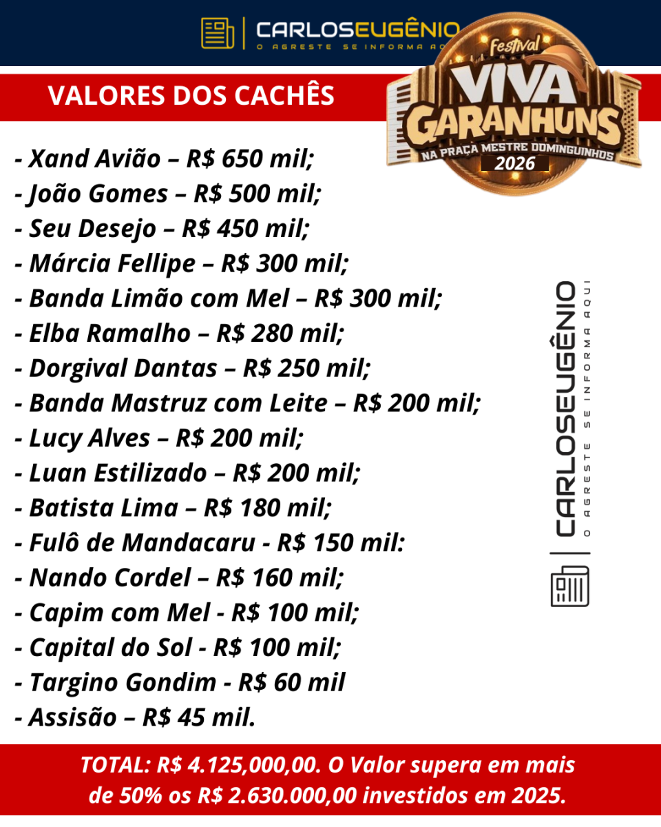 A Prefeitura de Garanhuns divulgou os cachês das apresentações das bandas Capim com Mel e Capital do Sol, além do cantor Targino Gondim, fechando os valores que serão investidos apenas com shows artísticos no Festival Viva Garanhuns, que acontecerá entre os dias 30 de abril e 3 de maio.