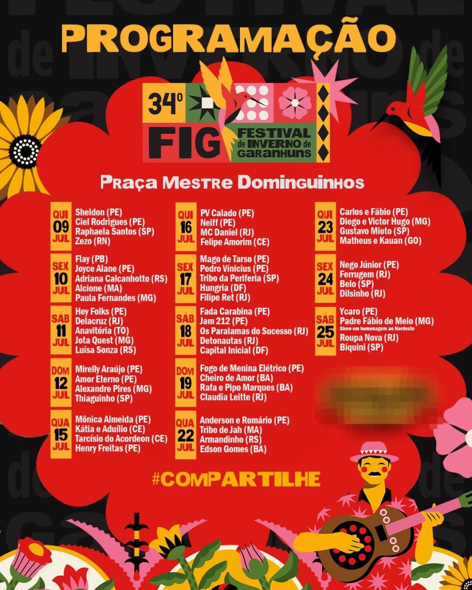 A Prefeitura de Garanhuns lançou, nesta sexta-feira, dia 10, a programação oficial do 34º Festival de Inverno (FIG), que será realizado entre os dias 9 e 26 de julho. Com mais de 20 polos culturais e atrações nacionais e regionais, o evento chega à sua 34ª edição consolidado como um dos maiores festivais multiculturais da América Latina.