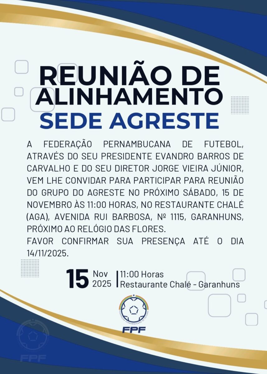 A Federação Pernambucana de Futebol (FPF) realiza nesse sábado, dia 15, uma reunião de alinhamento com representantes do futebol do Agreste. O encontro acontece às 11h, no Restaurante Chalé, em Garanhuns.