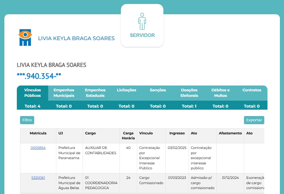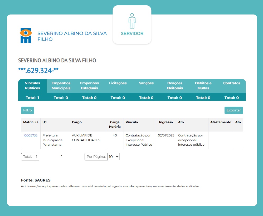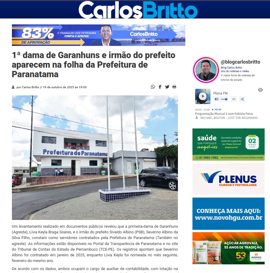 De acordo com Carlos Britto, as informações estão no Portal da Transparência de Paranatama e no site do Tribunal de Contas do Estado de Pernambuco (TCE-PE). “Os registros apontam que Severino Albino foi contratado em janeiro de 2025, enquanto Lívia Braga foi nomeada no mês seguinte, fevereiro do mesmo ano”, registra o Jornalista.