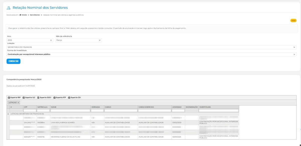 De acordo com os dados, ambos ocupam o cargo de auxiliar de contabilidade, com lotação na Secretaria de Finanças, e foram admitidos sob o regime de “contratação por excepcional interesse público”, modalidade prevista em lei para situações emergenciais e temporárias. Os registros indicam remuneração composta por vencimento base de R$ 2.000,00 e gratificações que elevam o total mensal para aproximadamente R$ 3.500,00.