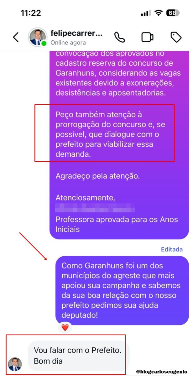 Em nota enviada ao Blog do Carlos Eugênio, os Professores informaram que receberam retorno de Carreras, que teria segundo eles, “se comprometido a dialogar com o Prefeito sobre a situação”. Apesar de imagem registrando o trecho de uma suposta conversa com o Parlamentar, a reportagem não conseguiu confirmar a informação dos Professores junto ao Deputado. A expectativa do grupo é que, considerando o histórico de destinação de recursos federais para Garanhuns por meio de Emendas Parlamentares viabilizadas por Carreras, a interlocução avance e os Profissionais possam vir a ser convocados.