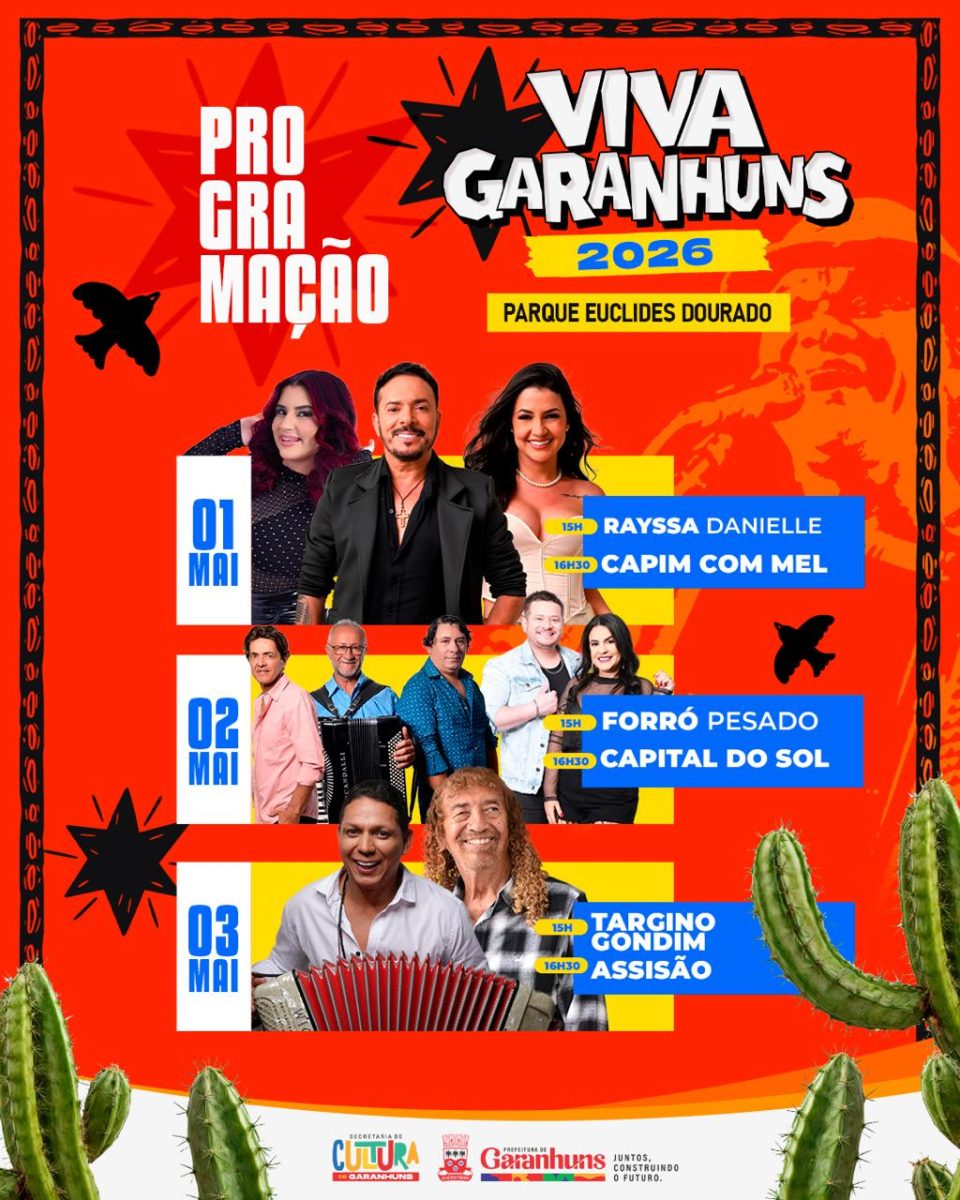 A Prefeitura de Garanhuns divulgou a programação completa do Viva Garanhuns 2026, evento que acontecerá entre os dias 30 de abril e 3 de maio e que marca, segundo a Gestão Municipal, “a abertura oficial do ciclo junino no Nordeste e celebra o legado do Mestre Dominguinhos”.