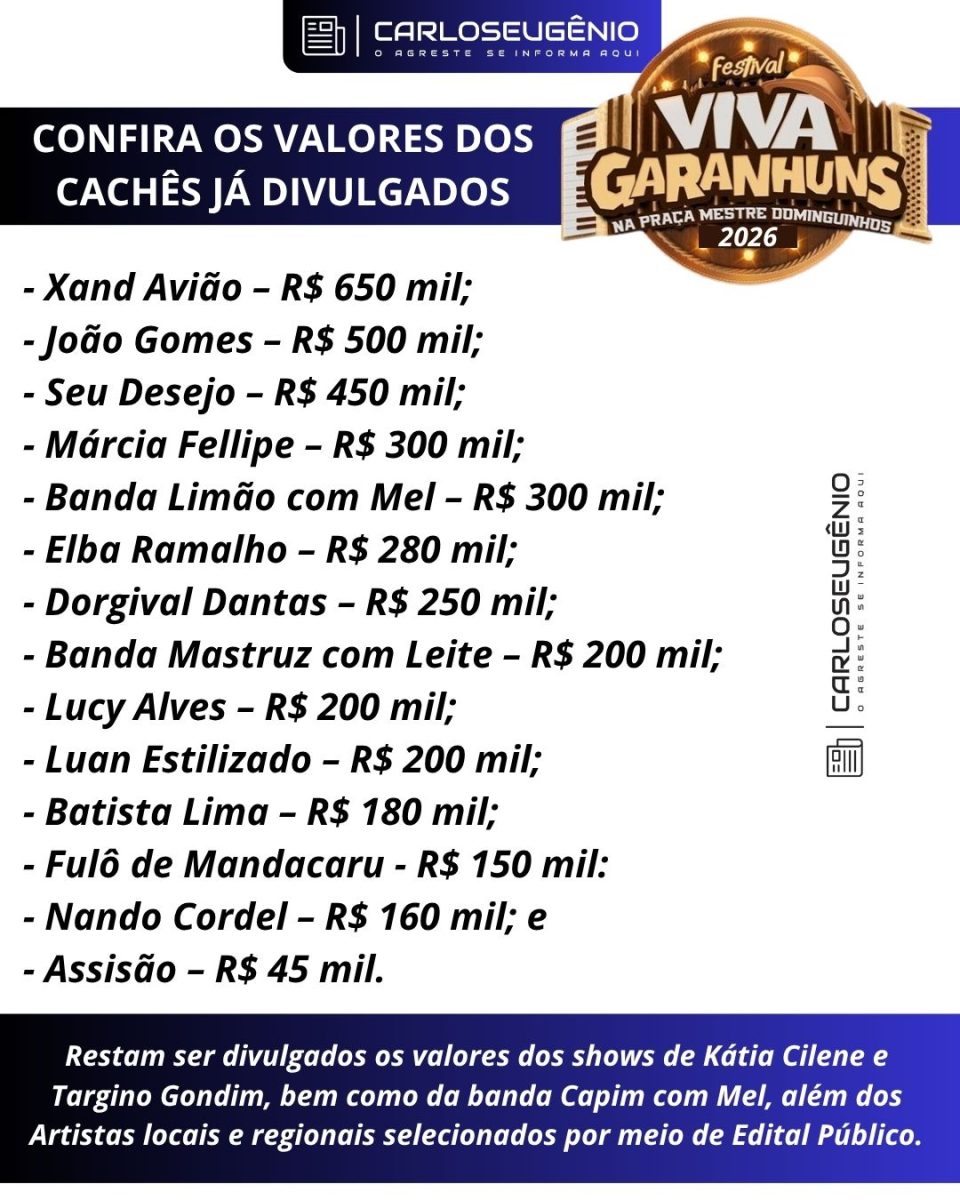 Além dos Cachês, o evento também envolve custos operacionais com estrutura, segurança e logística, elevando o investimento total. A expectativa da organização é que o Viva Garanhuns atraia grande público e impulsione a economia local. (@blogcarloseugenio)